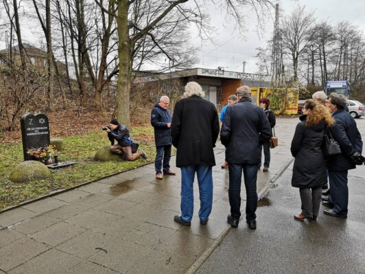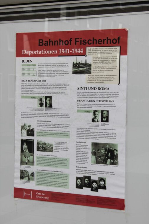 An der Stadtbahnhaltestelle Fischerhof unter der Brücke der S-Bahn-Haltestelle hat die Stadt Hannover eine Gedankentafel aufgestellt, die diese dunkelste Stunde der vom Bahnhof Fischerhof zwischen 1941 und 1944 durchgeführten Deportationen dokumentiert.