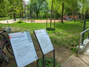 Der barrierefrei erreichbare Stadtteilpark bietet ein Basketballfeld, einen Pool und eine Free-Flow-Arena für Skater und BMX-Fahrer. Ein Stangenfitnesswald soll für anspruchsvolle Bewegungsmöglichkeiten genutzt werden. Aber auch Erholungssuchende kommen auf ihre Kosten. Zwischen großen Eichen, Erlen, Kastanien und Rotbuchen wurden Parkbänke aufgestellt. Man kann sich aber auch direkt am Ufer auf Steintreppen niederlassen.