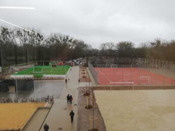 Im Außenbereich gibt es eine Multifunktionsfläche (1200 Quadratmeter) mit rotem Tartan-Belag, auf der viele Sportarten möglich sind. Zusätzlich steht ein Kunstrasenplatz (600 Quadratmeter) als Fußball-Kleinfeld zur Verfügung. Außerdem gibt es noch ein Beachvolleyballfeld mit 672 Quadratmetern, zwei Außen-Schachfelder, eine Kiss-and-Ride-Spur und Kinderspielmöglichkeiten.