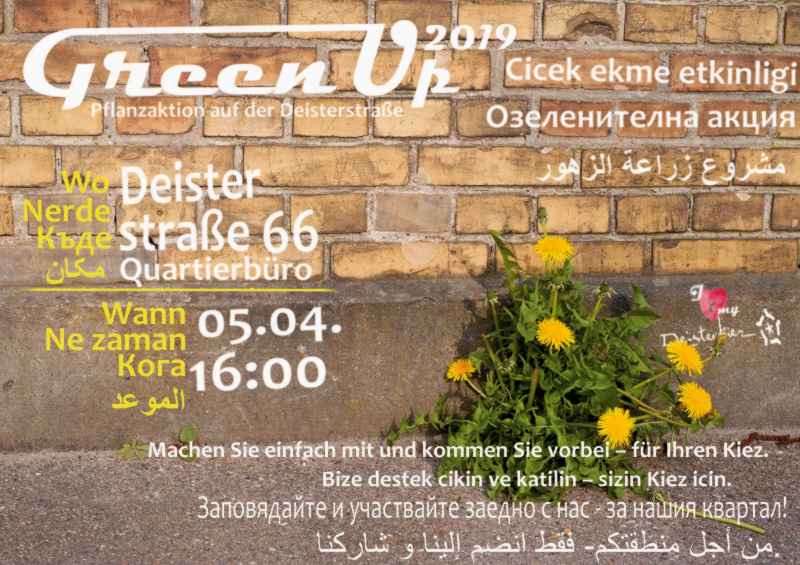 Der Winter soll so langsam dem Frühling weichen, denn der ganze Kiez sehnt sich nach Wärme, Blumen und mehr Buntem. Deswegen wird der Deisterkiez e.V. und seine Freunde am Freitag, den 5. April 2019, wieder das traditionelle GreenUP um 16 Uhr starten.