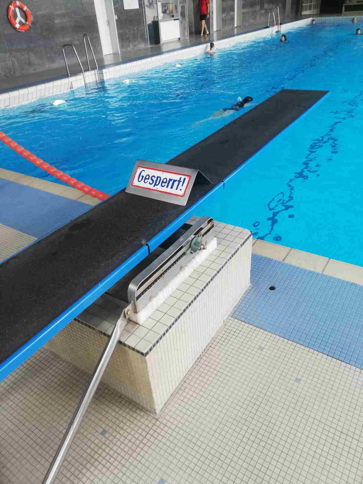 Für viele Mädchen und Jungen sind die Sprungbretter in jedem Schwimmbad das wesentliche Vergnügen, doch diese waren gesperrt. Eine freundliche Frage an den Schwimmmeister hat das aber schnell geändert. Denn sein ernstes Auge begleitet alle Wasserratten, die das Sprungbrett benutzten. Übrigens, das 3-Meterbrett wird auch auf Anfrage geöffnet, hier ist jedoch das Federn aufgrund der zu geringen Deckenhöhe nicht gestattet.
