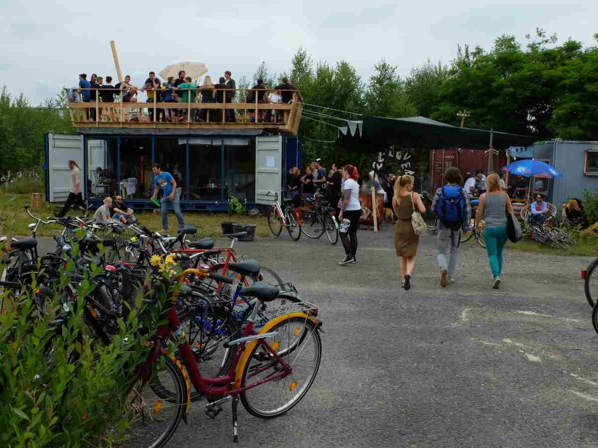 Nach der Bewilligung des Projektantrags wurde 2014 gleich die Basisstation gebaut, bestehend aus einem großen Container mit Dachterrasse. Diese Basisstation fungiert seitdem als Treff- und Aussichtspunkt des mit öffentlichen Fördergeldern unterstützten Vereins. Nach und nach kamen weitere Container hinzu, welche den individuellen Projektbedürfnissen entsprechend umgebaut und zum Teil mit Türen und Fenstern versehen wurden. So entstanden Außenterrassen für Gastronomie, Werkstätten, Ateliers, Übungsräume für verschiedene Gewerke und die ganz besonderen Bibliotheken. Diese Bibliotheken verleihen keine Bücher, aber Haushaltsgeräte, Werkzeuge, Kleidung und viele andere Dinge, deren Nutzung teilbar ist.
