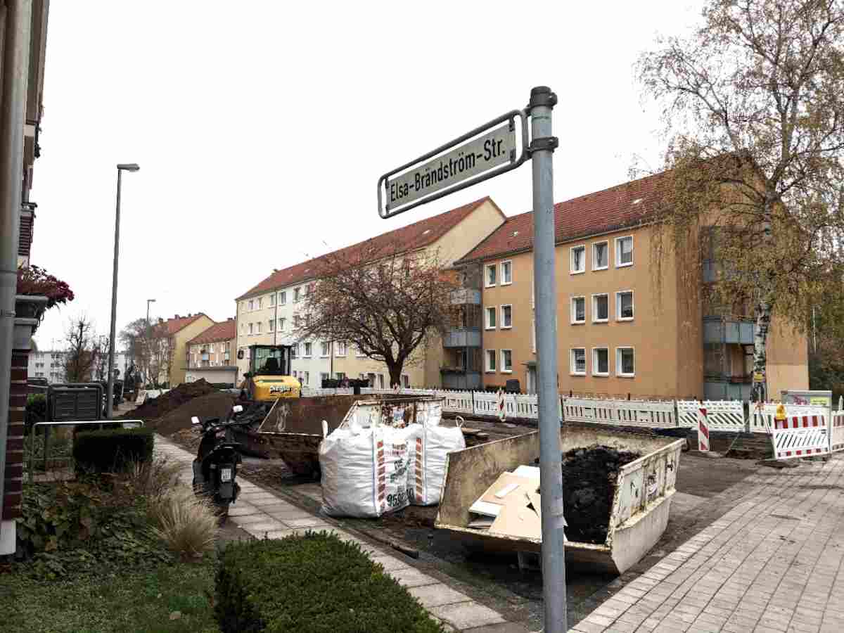 Im Rahmen des Sonderprogramms für Straßenerneuerung der Landeshauptstadt Hannover wird derzeit die Elsa-Brändström-Straße in Linden-Mitte in gesamter Länge grunderneuert. Für rund 280.000 € erhält die Fahrbahn eine neue Asphaltdecke und die Nebenanlage Fußweg wird mit Platten versehen. Das bisherige Granitkleinpflaster und der Asphalt auf der Fahrbahn, außerdem die Platten und das RE-Pflaster auf dem Fußweg waren in einem sehr schadhaften Zustand.