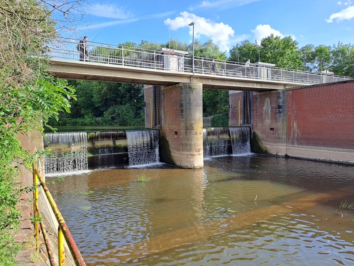 Die Leine fällt dann an der Wasserkunst hinab, kurz vorher trifft noch der Leineabstiegskanal auf den Fluss, der als Verbindung zum Mittellandkanal dient. In Höhe des Volksbad Limmer am Stockhardtweg schaut sie noch aus der Ferne auf die Wasserstadt Limmer und verabschiedet sich dann vom Stadtbezirk im Zickzackkurs in Richtung Nord-Westen.