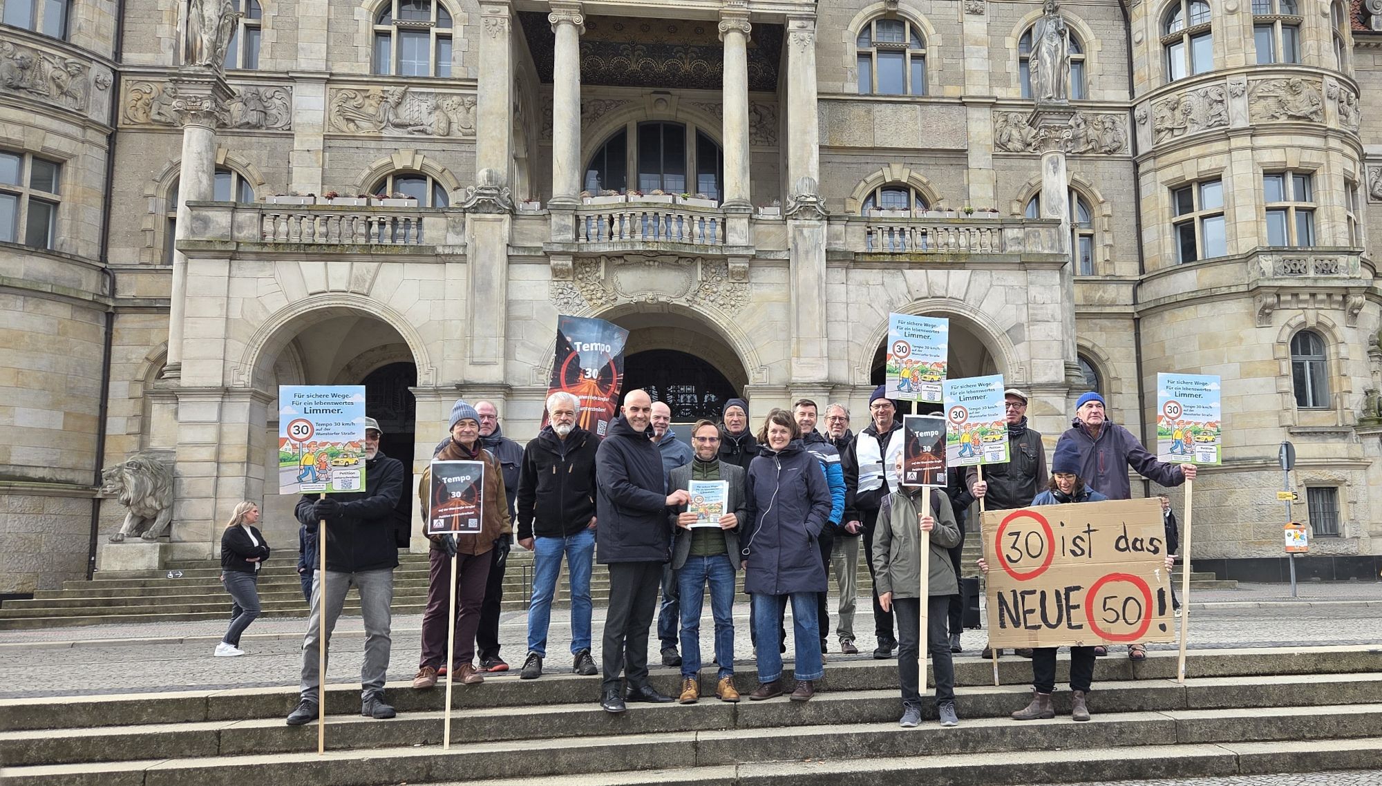 1270 Personen wollen, dass auf der gesamten Wunstorfer Straße eine durchgehende Geschwindigkeitsbegrenzung von Tempo 30 gilt. Mitglieder der BI Wasserstadt Limmer haben die Petition mit den Unterschriften und einen Antrag zur Umsetzung an die Verwaltung von Oberbürgermeister Belit Onay übergeben. Der sichtlich erfreute Verwaltungschef sicherte eine rasche Prüfung des Antrages zu. Auch der Stadtbezirksrat Linden-Limmer hat sich für Tempo 30 in der Bundesstraße ausgesprochen.