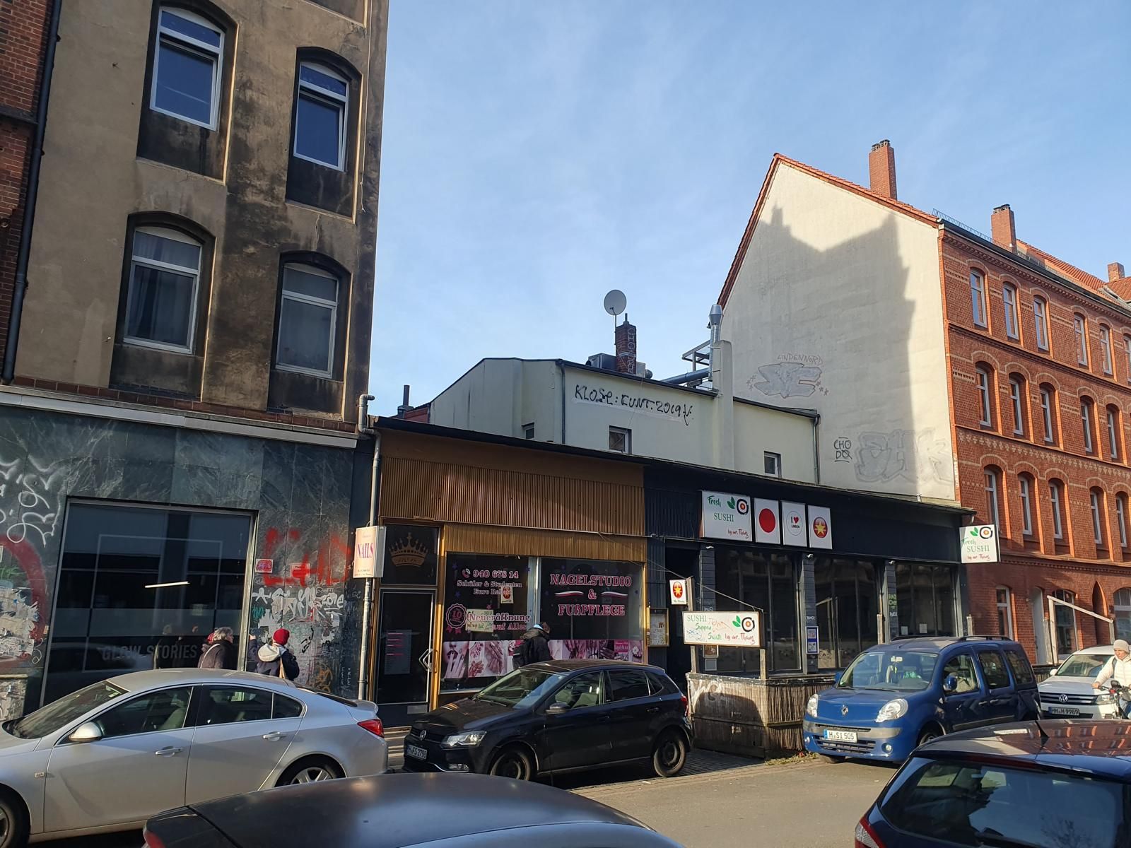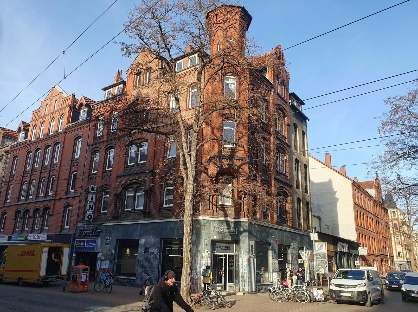 Manche erinnern sich noch an die langjährige Kneipentradition in diesem Flachbau. 1973 eröffnete hier – nach dem Einstieg in das Apollo – Kinozar Achim Flebbe mit seinem Partner, dem damaligen NDR-Journalisten Giselher Schaar, die „Apollos Pinte“, nach dem „Ei“ eine der ersten Szenekneipen in Linden. Danach hieß der beliebte Laden jahrelang „Klimbim“, zeitweilig mit Diskobetrieb im Kellergeschoss. Es folgten diverse andere Gaststätten, zuletzt ein asiatisches Sushi-Bistro und ein Nagelstudio. Beide Geschäfte wurden zum Jahreswechsel gekündigt, die Räumlichkeiten stehen nun leer.
