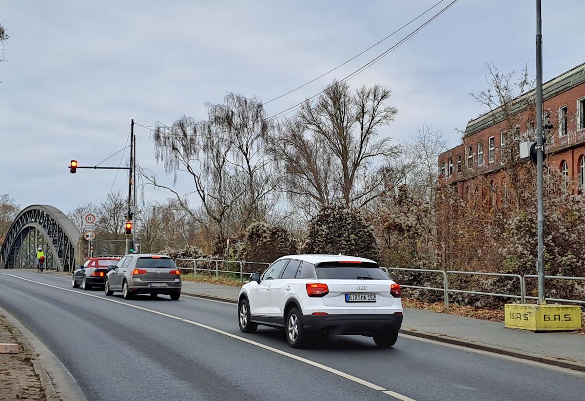Die Stadtverwaltung folgte der Empfehlung und ließ eine mobile Ampelanlage installieren. Diese steht inzwischen und soll Radfahrenden das gefahrlose Einfädeln in den fließenden Verkehr ermöglichen. Die Funktionsweise ist denkbar einfach: Nähert sich ein Radfahrender auf dem nördlichen Radweg der Brücke aus östlicher Richtung, schaltet die Anlage automatisch auf Rot für den motorisierten Verkehr und gleichzeitig auf Grün für den Radverkehr.