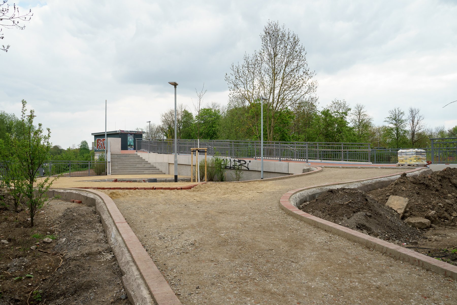 Für die Fertigstellung der neuen, barrierefreien Rampenanlage zu den Brücken über Leine und Lindener Stichkanal nahe der Wasserkunst hat die Hannoversche Stadtverwaltung einen neuen Termin genannt. Laut der aktualisierten Beschilderung an der Baustelle soll die Sperrung nun Mitte Mai aufgehoben werden. Punkt-Linden hat mal wieder über den Bauzaun geschaut. Tatsächlich scheint der genannte Zeitrahmen realistisch. Im Großen und Ganzen mutet die Anlage weitestgehend fertig an. Der Großteil der Wege ist gepflastert, einige Restarbeiten sind noch zu erledigen. Ob der Termin tatsächlich gehalten wird, muss sich natürlich noch zeigen.