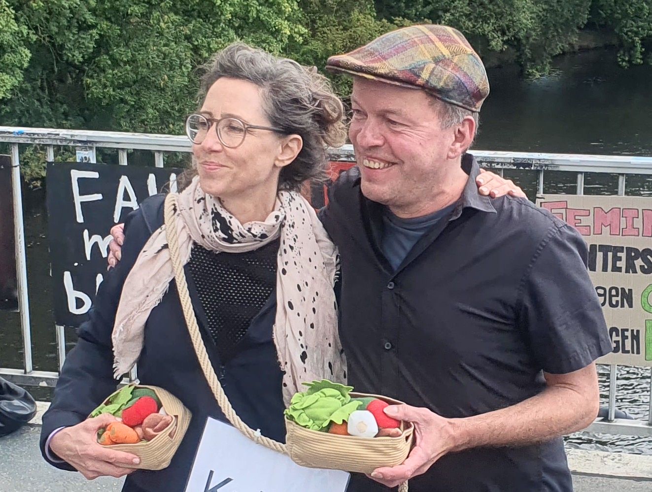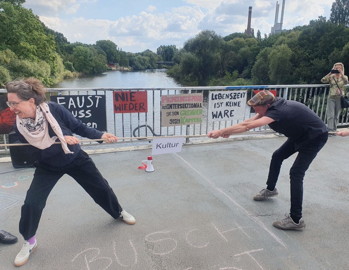 Das lustige Tauziehen auf der Dornröschenbrücke um die Kultur endete – wie auch von den gut zwei Dutzend Zuschauenden erwartet – mit einem Unentschieden. Eva Jandl-Jörg, Direktorin des Museums Wilhelm Busch, und Jörg Smotlacha vom Faust lagen sich zum Schluss in den Armen. Namens beider Kultureinrichtungen erklärten sie ihre Freundschaft und Solidarität und verkündeten eine Kooperation, die zunächst mehrere niedrigschwellige Angebote umfasst.