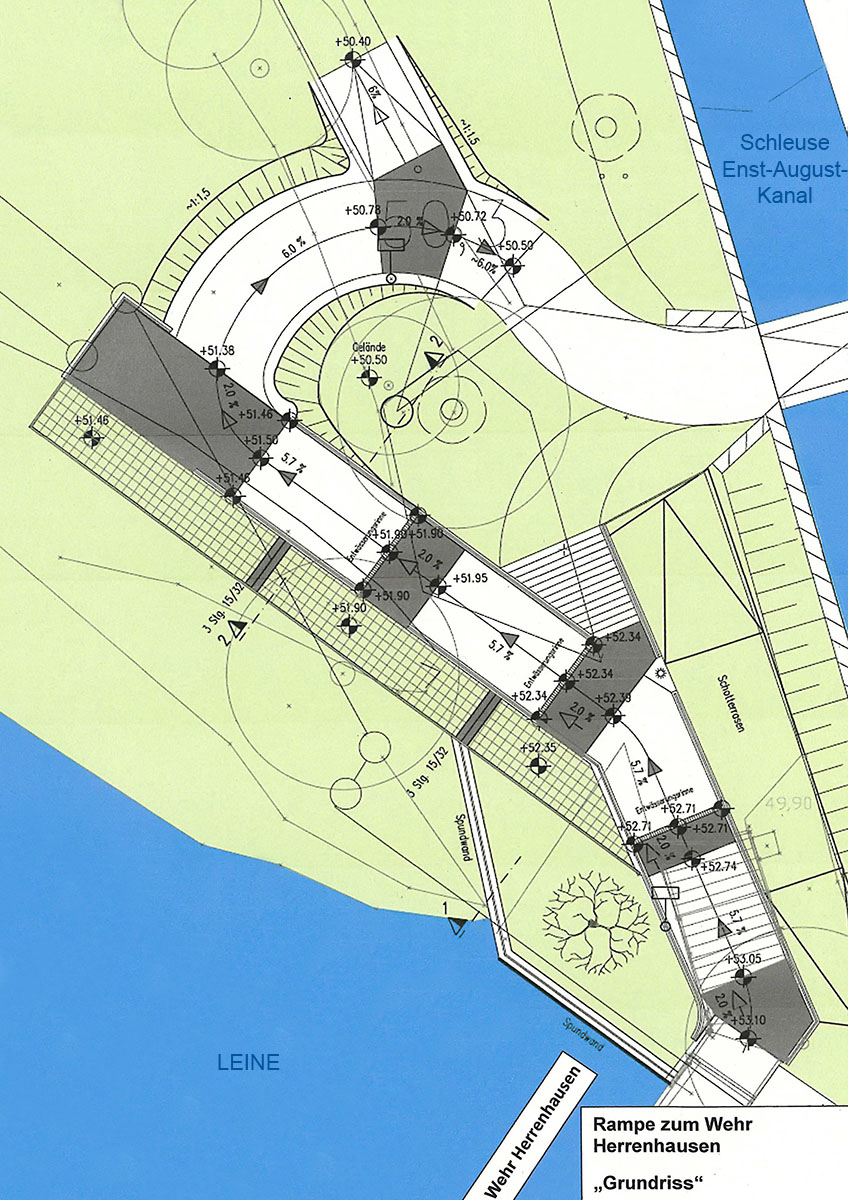 Seit Anfang April dieses Jahres baut die Stadt Hannover in Kooperation mit der Wasserstraßen- und Schifffahrtsverwaltung an einem barrierefreien Aufgang zu Brücke über das Leine-Wehr an der Herrenhäuser Wasserkunst. Für die Baumaßnahme wurden die Brücken über das Leine-Wehr sowie die Brücke über den Verbindungskanal Leine gesperrt.