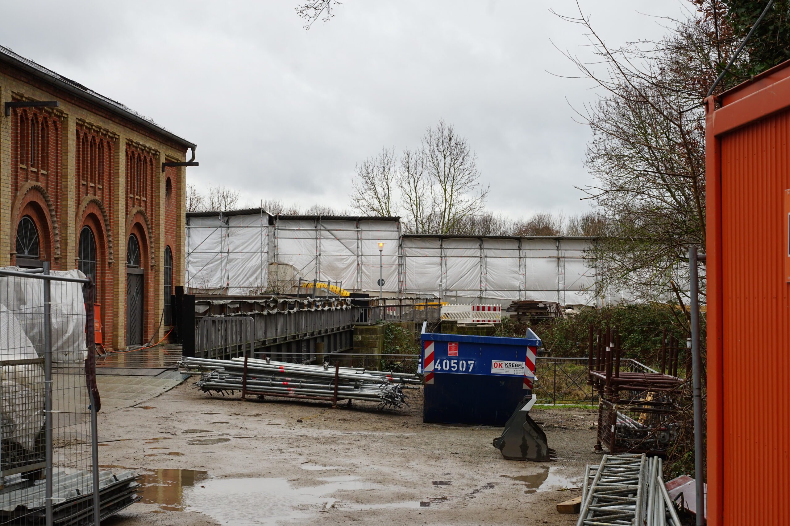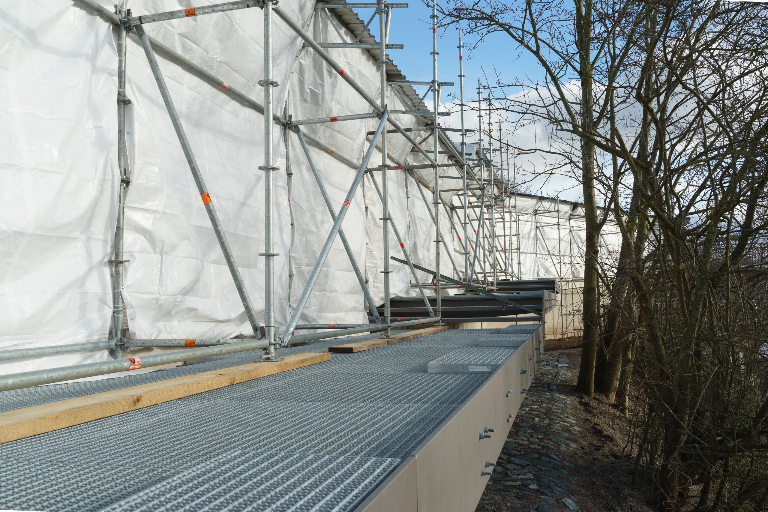 Wenn man häufiger über den Bauzaun schaut, beobachtet man nur sehr schleppende Fortschritte. Nachdem Fundamente gegossen wurden, ragen inzwischen die Betonverschalungen einiger Seitenwände der Rampe empor. Vom anderen Ende der Brücke am Wasserkraftwerk aus sieht man teilweise die neuen Geländer-Erhöhungen, welche die Brücke für Radfahrer sicher passierbar machen sollen. Vom neuen Bodenbelag auf der Brücke ist noch nichts zu sehen.