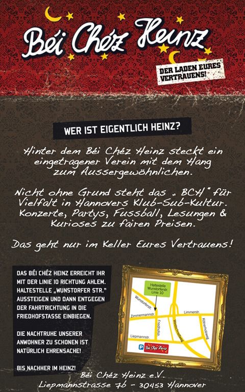 Die Geschichte des „Béi Chéz Heinz“, oder kurz „BCH“ genannt, ist eng mit dem Fössebad in Limmer verbunden, das wundert einen nicht, wenn man weiß, dass das „Heinz“ im ehemaligen Fahrradkeller des Bades in der Liepmannstraße seinen Ursprung hat.