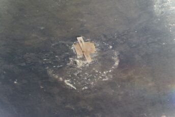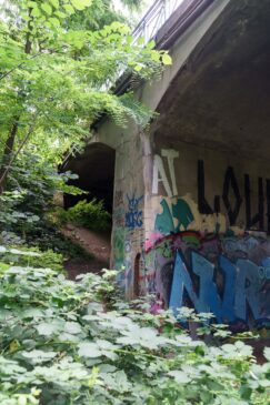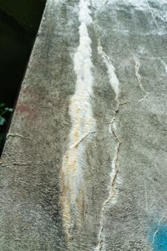 An der Unterseite des Brückenbauwerks sind an zahlreichen Stellen starke Rissbildungen und Ausblühungen erkennbar. An manchen Stellen ist Beton abgeplatzt, an denen sich stark korrodierte Stahlarmierungen zeigen.