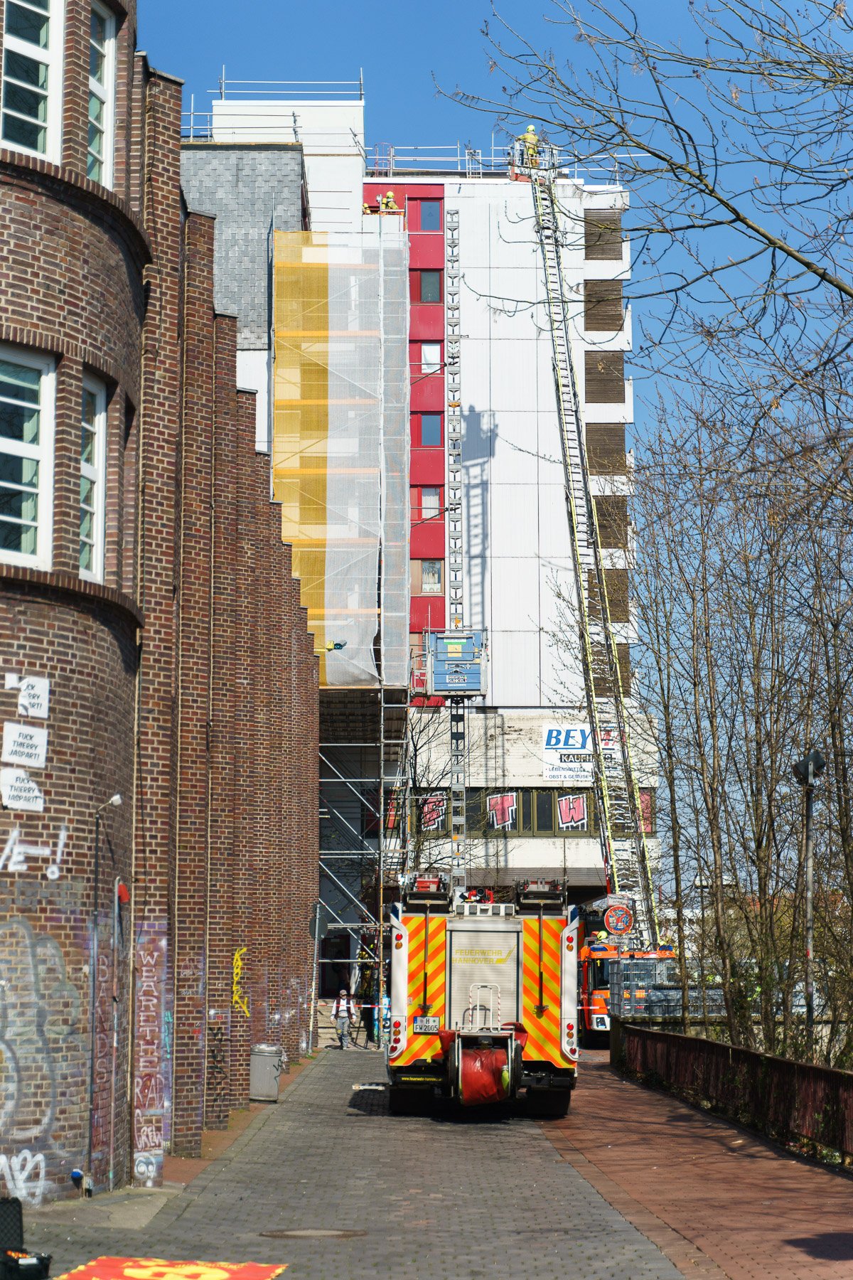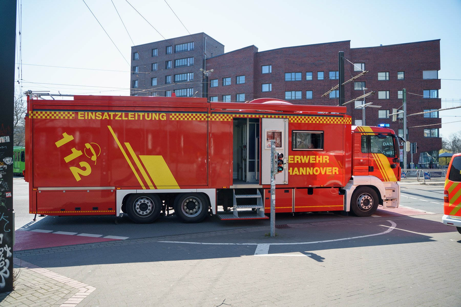 Heute Mittag (06.04.2023) gegen 12:00 Uhr wurde die Feuerwehr zum Ihme-Zentrum (Linden-Mitte) alarmiert. Bei Dacharbeiten im Haus Am Ihmeufer 3 war von Handwerkern eine starke Rauchentwicklung entdeckt worden. Die Leitstelle der Feuerwehr sendete aufgrund der Größe des Objektes gleich zwei Löschzüge sowie ein großes Einsatzleitfahrzeug und ein ABC-Atemschutz-Unterstützungsfahrzeug zur Einsatzstelle neben dem Capitol-Hochhaus. Vor Ort bestätigte sich ein Brand hinter der Schieferverkleidung des Dachgeschosses. Unterstützt wurden die Feuerwehrleute von den dort arbeitenden Dachdeckern. Zur Brandbeobachtung setzte die Feuerwehr auch eine Drohne ein, da zum Erreichen des Brandherdes die Länge der Feuerwehrdrehleiter nicht ausreichte.