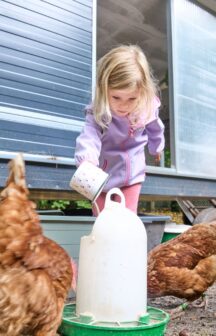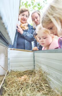 Jeden Morgen kümmern sich die Kinder in der „Morgenschicht“ um die Verpflegung der Hühner. Neben dem Füttern dürfen sie die Tiere auch streicheln und gelegentlich auf den Arm nehmen. Besonders stolz trägt Tamina heute die Henne Rosa, während die anderen Kinder staunend beobachten. „Sie hat ganz weiche Federn“, bemerkt Tamina, als sie sanft über das Gefieder der Henne streicht.
