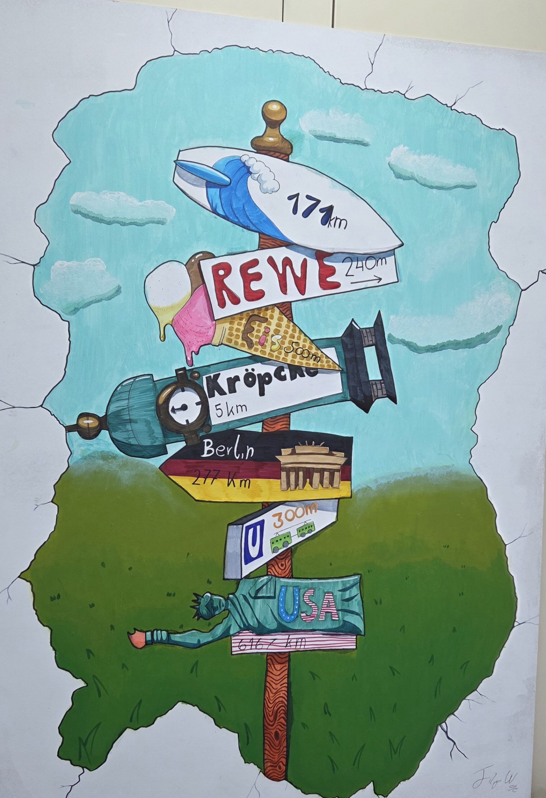 Das Programm „HandWerk x anders“ wurde von der Stadtteilkultur | Kulturelle Kinder- und Jugendbildung der Landeshauptstadt Hannover entwickelt und mit Mitteln der Drucksache ‚Initiativen zur kulturellen Bildung für Jugendliche‘ an der IGS Badenstedt realisiert. Zielgruppe sind Jugendliche in der Phase der Berufsorientierung und wird für Schüler*innen der 8. bis 10. Jahrgangsstufe im jeweils regulären Praktikumszeitraum angeboten. An dem kreativen Praktikumsprojekt, welches vom 10. – 21. November 2025 für Schüler*innen der 9. Klassen angeboten wurde, nahmen insgesamt 12 Jugendliche teil. Das in diesem Durchgang gleichermaßen handwerklich und künstlerisch ausgerichtete Projekt wurde von dem auf dekorative Wandmalerei spezialisierten Maler Oliver Imcke (Inhaber Pintado Gestaltung), der Kunstvermittlerin Malin Momo Denkena und der Künstlerin Carlotta Oppermann geleitet. Im Rahmen des Projekts lernten die Jugendlichen verschiedene kreative Techniken und Gestaltungsformen der Malerei und Wandmalerei kennen und gestalteten unter dem thematischen Leitmotiv „Insel“ gemeinsam den Auszeit- und Workshopraum im Schulgebäude.