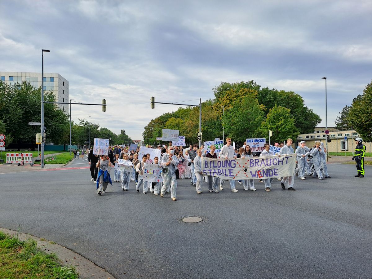 Heute war es so weit: Eltern, Lehrer und Schüler haben für einen sicheren Schulbetrieb demonstriert. Es ging von der St. Martinskirche um 10 Uhr direkt neben der IGS Linden aus los. Aus dem Von-Alten-Garten bog der Tross mit ca. 1.400 Schülern in die Posthornstraße ein und zog dann über den Allerweg in die Lavesallee ein. Es ging danach geradewegs auf das Rathaus am Trammplatz, der demnächst „Platz der Menschenrechte“ heißen wird, zu.