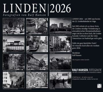Seit vielen Jahren sind die Kalender von Ralf Hansen ein fester Bestandteil des Lindener Jahreswechsels. Auch die 22. Ausgabe bleibt dem bewährten Konzept treu: Linden in Schwarzweiß, ruhig beobachtet und präzise komponiert.