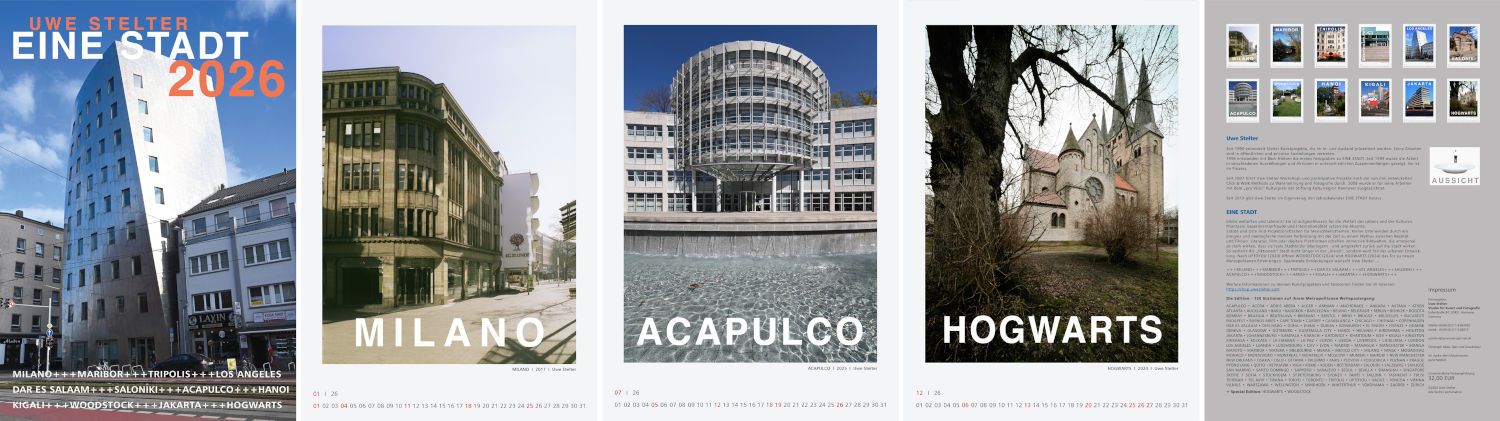 Der Jahreskalender EINE STADT 2026 nimmt die Betrachterinnen und Betrachter mit auf eine visuelle Weltreise. Zwölf „Entdeckungen“ verbinden reale Metropolen mit ikonischen, teils fiktionalen Orten. Städte wie Mailand, Los Angeles oder Hanoi stehen gleichberechtigt neben Woodstock und Hogwarts. Die Botschaft ist klar: Ein Stadtbild wird längst nicht mehr nur von großen Metropolen geprägt, sondern auch von Ideen, Mythen und kulturellen Referenzen aus kleinen oder imaginären Orten.