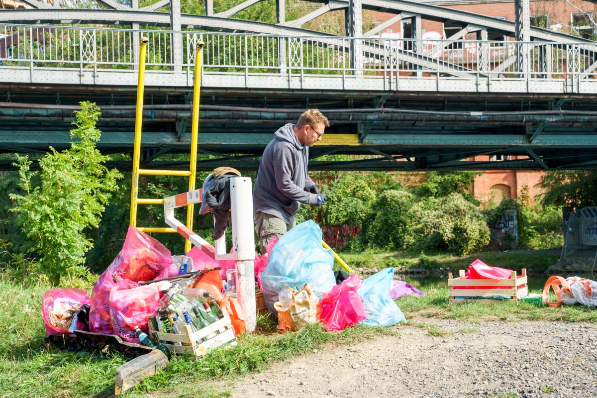 Für dieses Event hat sich aha bereit erklärt, Abtransport und Entsorgung der gesammelten Abfälle zu übernehmen. Es kam wieder einiges zusammen. Neben vielen Säcken Müll und einer Menge Altglas fanden sich auch mehrere Autoreifen, eine herausgerissene Rettungsleiter, die aus dem Kanal geangelt wurde, sechs Einkaufswagen und eine Absperrbake nebst Warnleuchte. Passanten und Inhaber von Kleingärten der angrenzenden Gartenkolonie bedankten sich bei den Teilnehmer*innen für ihr Engagement. Insgesamt also wieder eine saubere Sache!