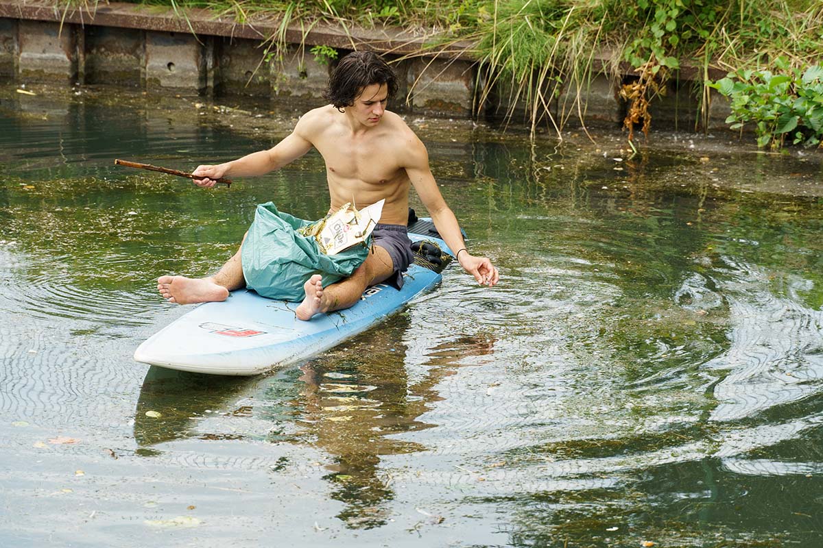 Über mehrere Social-Media-Kanäle lud Gustav Kahn (18 Jahre), Initiator der Aktion „cleanup.hannover“, am Sonntag um 11 Uhr zum Großreinemachen am Lindener Stichkanal entlang der Sichelstraße in Limmer ein. Vor dem Henkel-Werktor sammelte sich ein aus freiwilligen Helferinnen und Helfern bunt zusammen gewürfelter Reinigungstrupp, um den unerfreulichen Hinterlassenschaften der Kanalbesucher zwischen Hafenschleuse und Eichenbrink eine Abfuhr zu erteilen. Gustav hat als Unterstützung seinen Vater und einige Freunde mitgebracht. Für den späteren Abtransport des Mülls stand ein großer Anhänger bereit. Die Aktion war sogar amphibisch ausgerüstet: Um an Abfälle im Wasser zu gelangen, wurden Standup Paddling Boards mitgebracht.