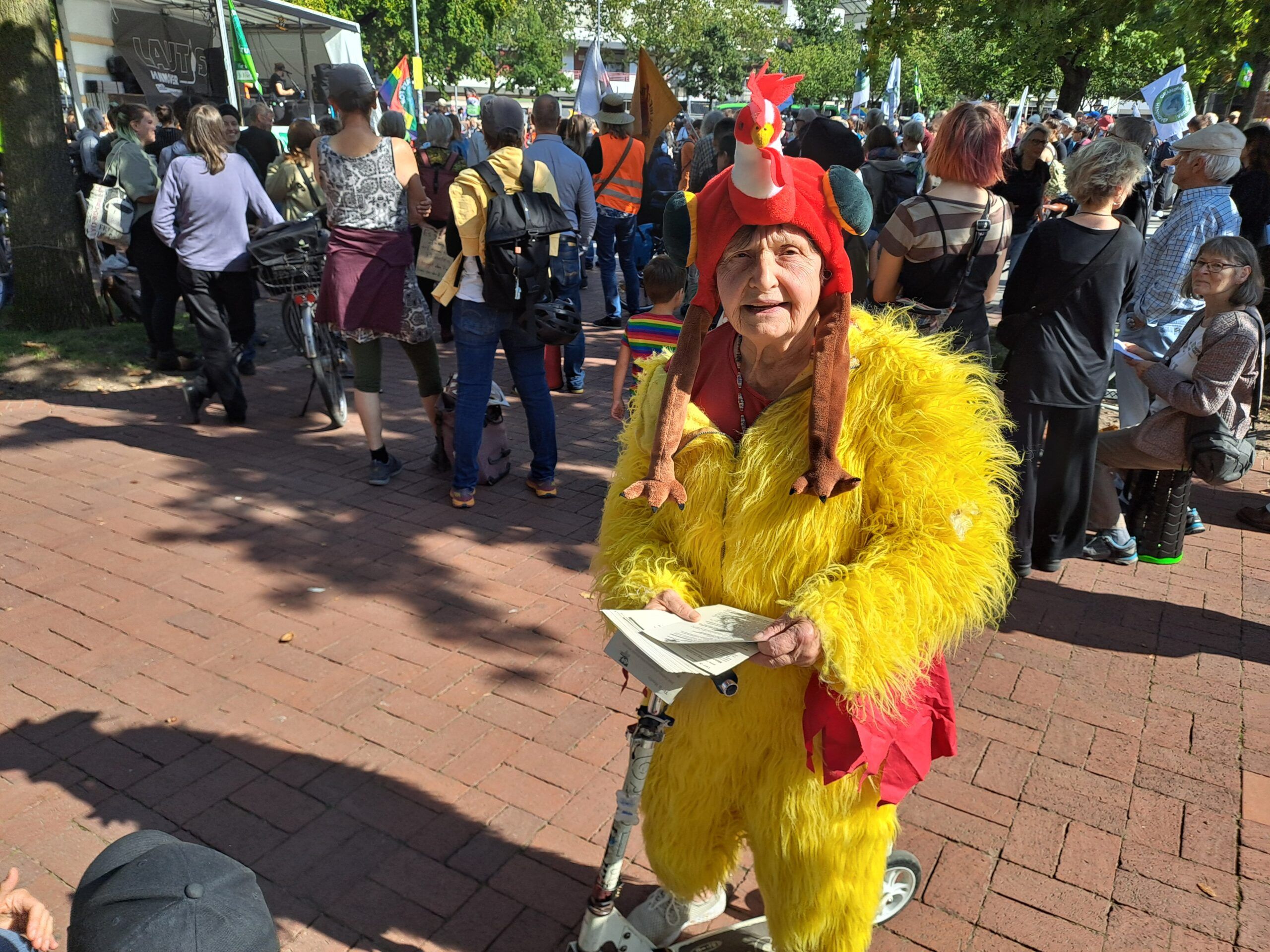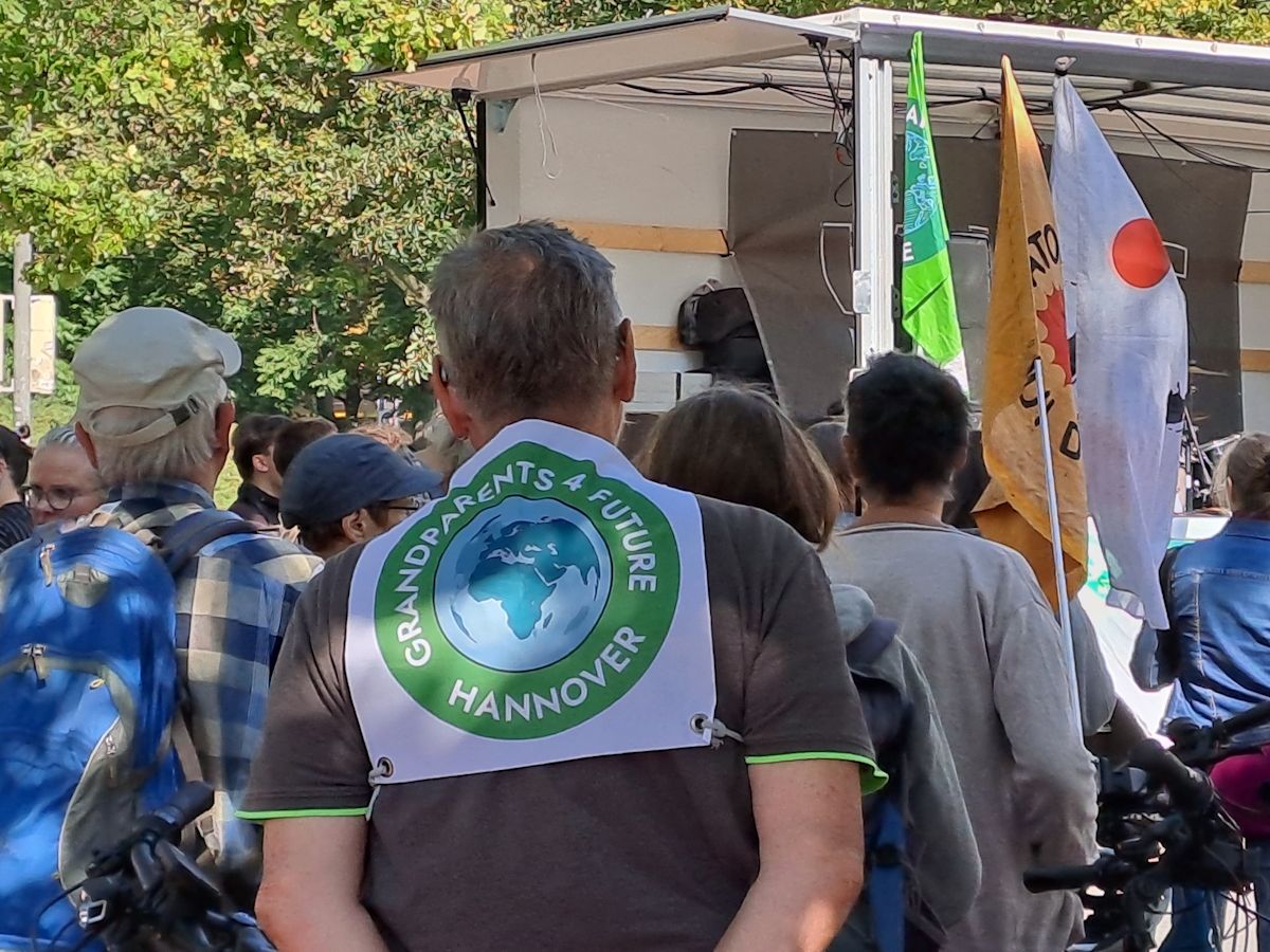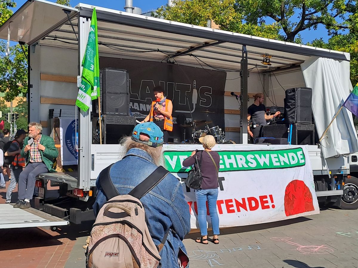 Danach kamen die doch sehr sachlichen Redebeiträge, nicht ausschließlich von jungen Menschen – auch Kritik zu rechten Einflüssen. Einige andere Gruppierungen hatten sich der Demonstration angeschlossen, wie „attac“, „Janun“, „Alle fürs Klima“ und der recht neuen Vereinigung „Grandparents4Future“. Auch die Aktion „Tier und Mensch“, vertreten durch eine krass als gelbes Huhn verkleidete Teilnehmerin, war dabei. Anschließend zogen die Teilnehmer der Demonstration über die Leinertbrücke in Richtung Nordstadt, wo beim „Parking Day“ der Höhepunkt der Veranstaltung stattfand.