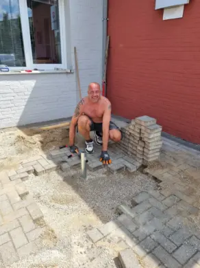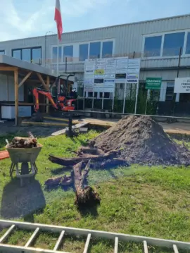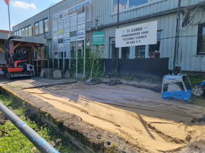 Schon am frühen Samstagmorgen, um 8 Uhr, rollte Sascha mit schwerem Gerät zum Vereinsgelände am Fösseweg 5 an. Ziel: die bislang eher vernachlässigte Fläche rechts neben dem Grillhaus. Mit vereinten Kräften wurde der Bereich von alten Baumstumpfresten befreit, neu gepflastert und gleich um mehrere Quadratmeter erweitert – ein echter Gewinn für künftige Vereinsfeste.
