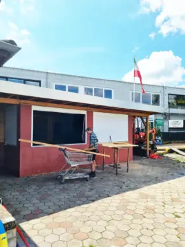 Bereits in der Vorwoche wurde die Terrasse mit neuen Lampen und einem Infokasten aufgewertet. Auch für die kommenden Tage steht noch einiges an: Malerarbeiten an den Außenkabinen, der Front des Grillhauses und im Bereich vor der Küche sind vorbereitet und warten auf ihren Feinschliff.