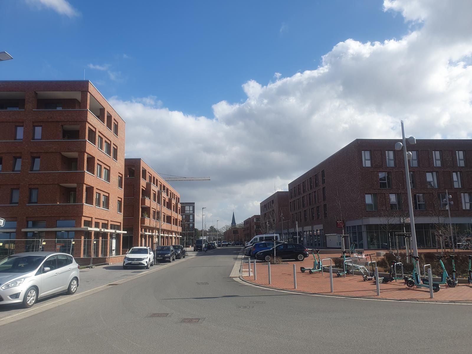 Gearbeitet wird in der Wasserstadt aktuell nur noch an den Wohngebäuden der Baugemeinschaft JAWA – hier dreht sich ein letzter Kran. Der Spielplatz im „Grünen Finger“ bleibt vorerst abgesperrt und wartet auf seine Freigabe. Auch die Gestaltung des „Uferparks“ und des „Gedenkortes“ für das Frauen-KZ stehen noch aus. Ansonsten ist der erste Bauabschnitt der Wasserstadt fertiggestellt, inklusive eines Cafés im REWE-Supermarkt.
