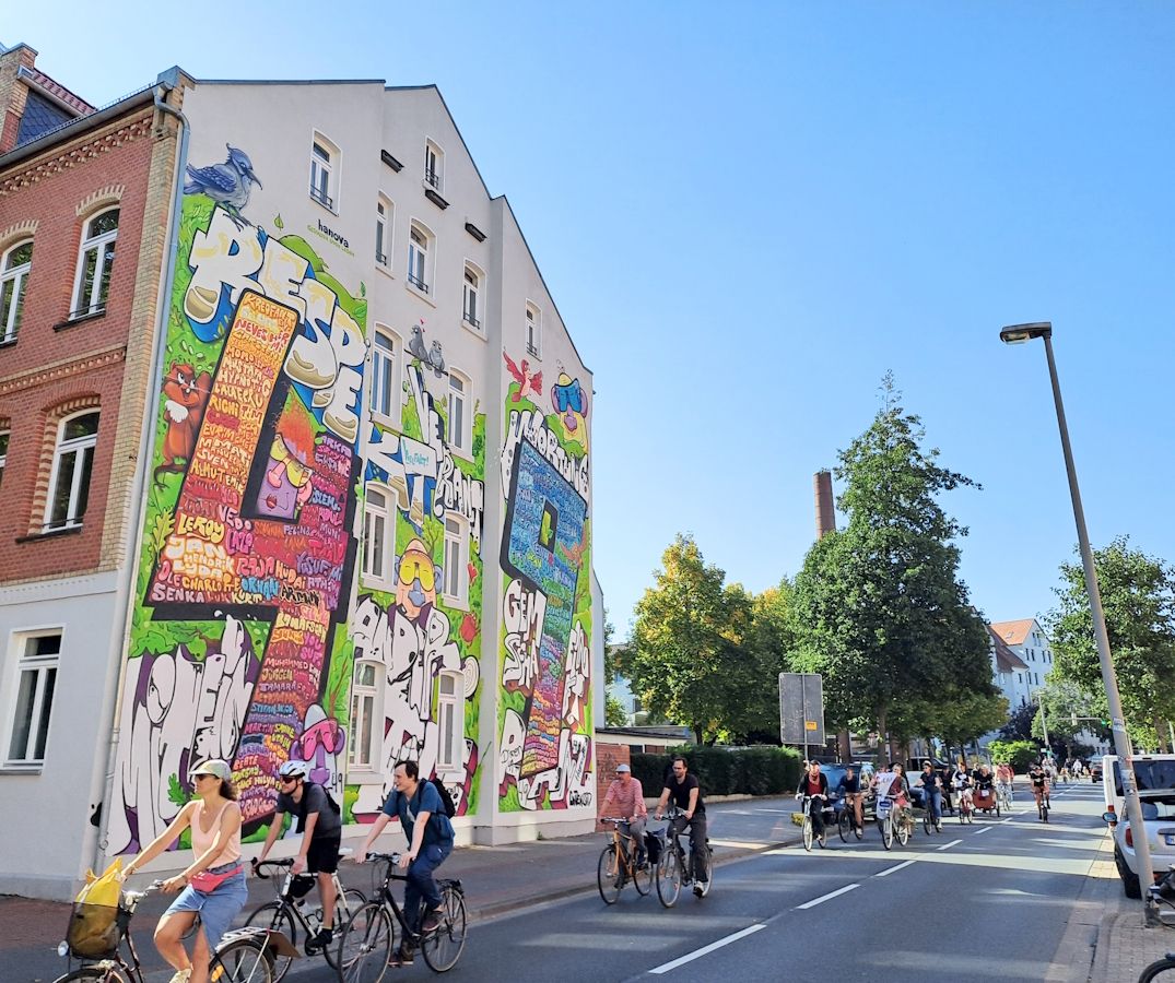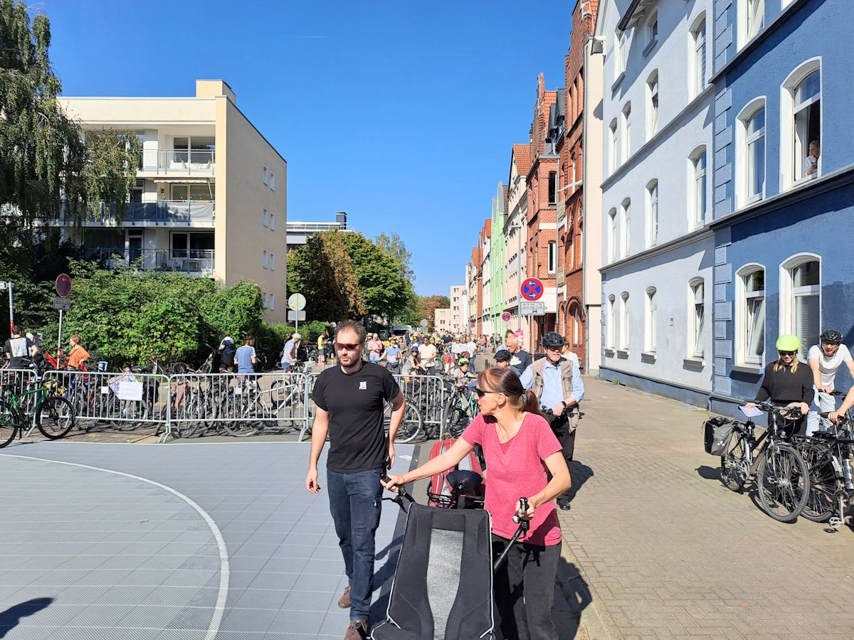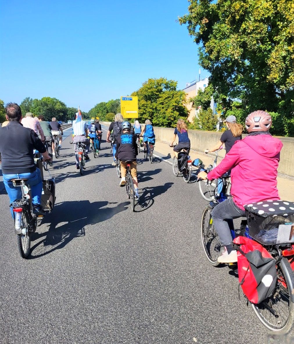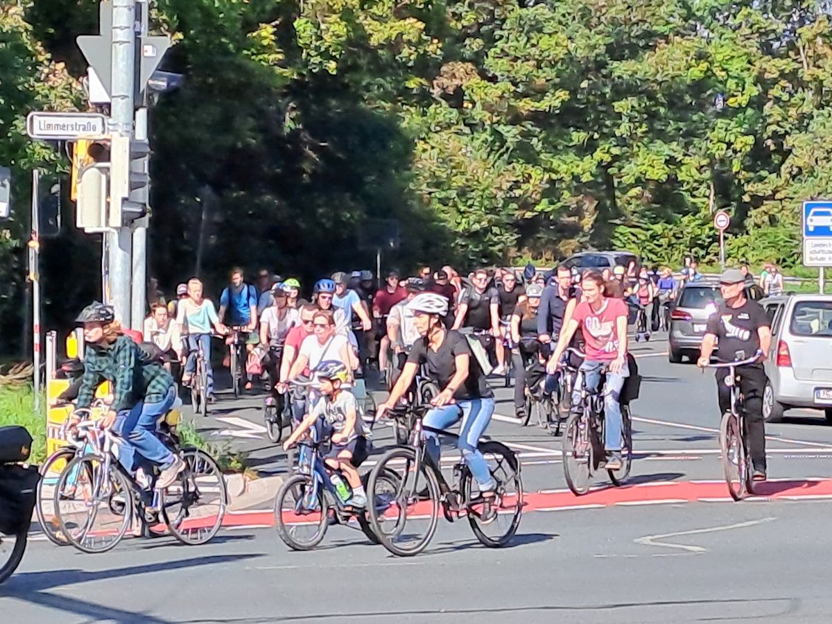 Nach den sehr interessanten Redebeiträgen am Küchengarten ging es für mit Fahrrädern ausgerüsteten Teilnehmern, und das waren so gut wie alle, los. Die Route verlief direkt vom Küchengarten über Schwarzer Bär, Deisterstraße, Allerweg, die Ritter-Brüning-Straße und den Ricklinger Kreisel direkt auf die B6/Westschnellweg. Nach dem Passieren des Hanomagkreisels/Deisterplatz ging es nach Norden weiter zur Ausfahrt Linden-Nord. Die Strecke führte dann über die Limmerstraße und Wunstorfer Straße nach Limmer, wo die Teilnehmer wie geplant auf die zur Zeit laufende MobiWoche am Margarethe-und-Max-Rüdenberg-Platz trafen.