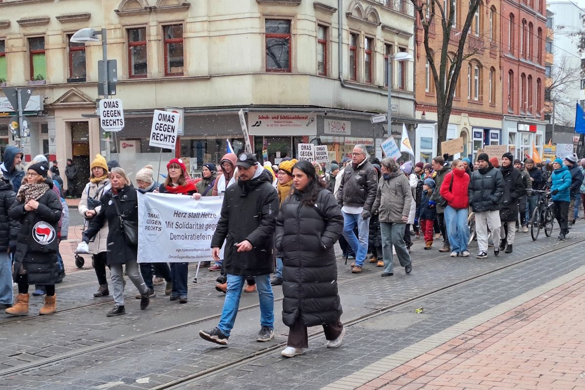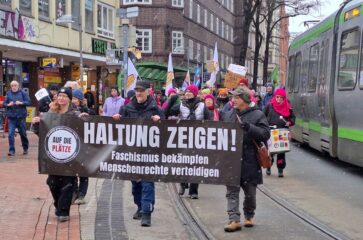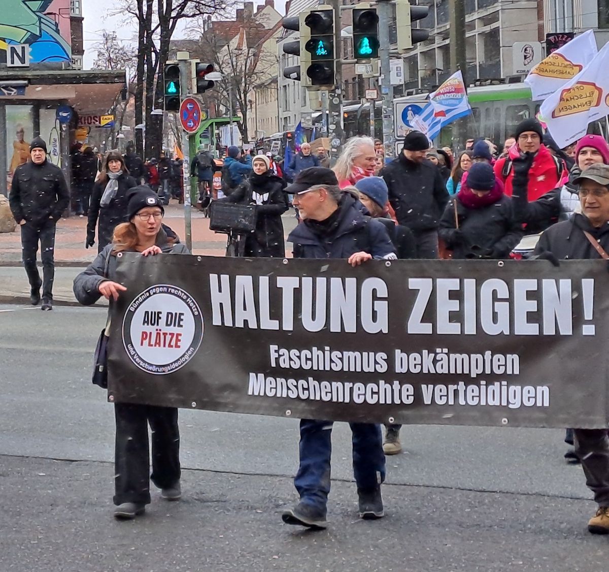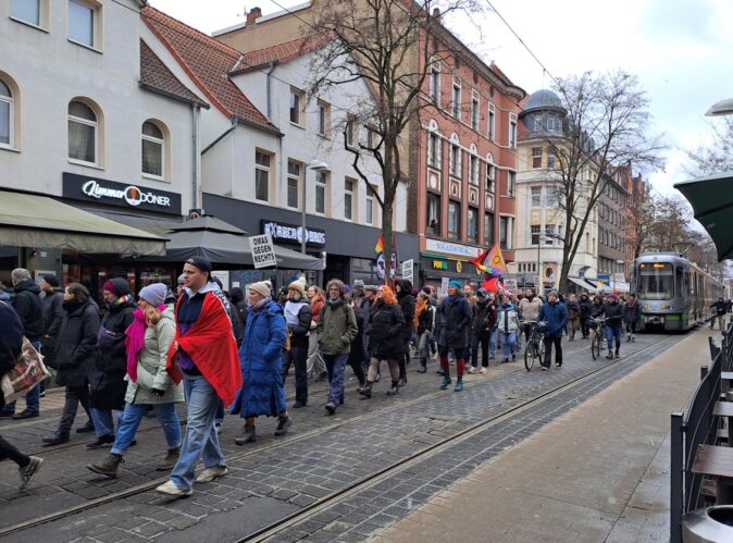 Am gestrigen Samstag war was los in der Limmerstraße und Am Küchengarten. Zirka 500 Demonstrierende versammelten sich an der Ecke des Kötnerholzweg/Limmerstraße und zogen dann gemeinsam zum Küchengarten. Busse, Bahnen und auch Radfahrer mussten stoppen. Auf dem Platz in Linden-Mitte fand dann, wie schon bei der Demo 2024, eine Kundgebung statt.