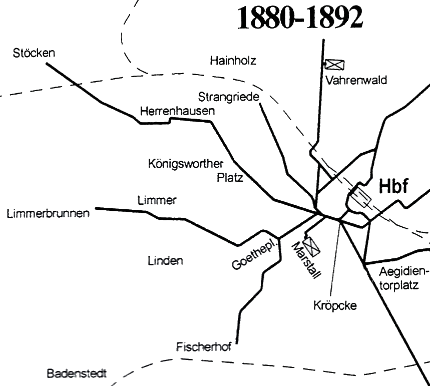 Im Jahr 1892 fuhr die Pferdebahn der ÜSTRA-Linie 12 auf einer Strecke, über die Harenberger Straße und führte und bis zum Limmerbrunnen. 1893 wurde die Pferdebahnlinie auf einen elektrischen Betrieb umgestellt, aber nur bis zur Brunnenstraße bei der Lindener Hafen-Schleuse. Im Jahr 1896 übernahm die Linie 6 die historische Vorgängerin der heutigen Stadtbahnlinie 10.