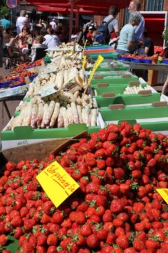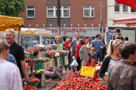 Auch heute heißt es jeden Dienstag und Samstag noch: Treffpunkt Markt. Von 8:00 bis 13:00 Uhr gibt es bei den Markthändlern alles, was das Herz begehrt. Gemüse über Wurst und Fleischwaren, Käse, Obst, Brot bis zu Blumen – alles für den täglichen Bedarf.
